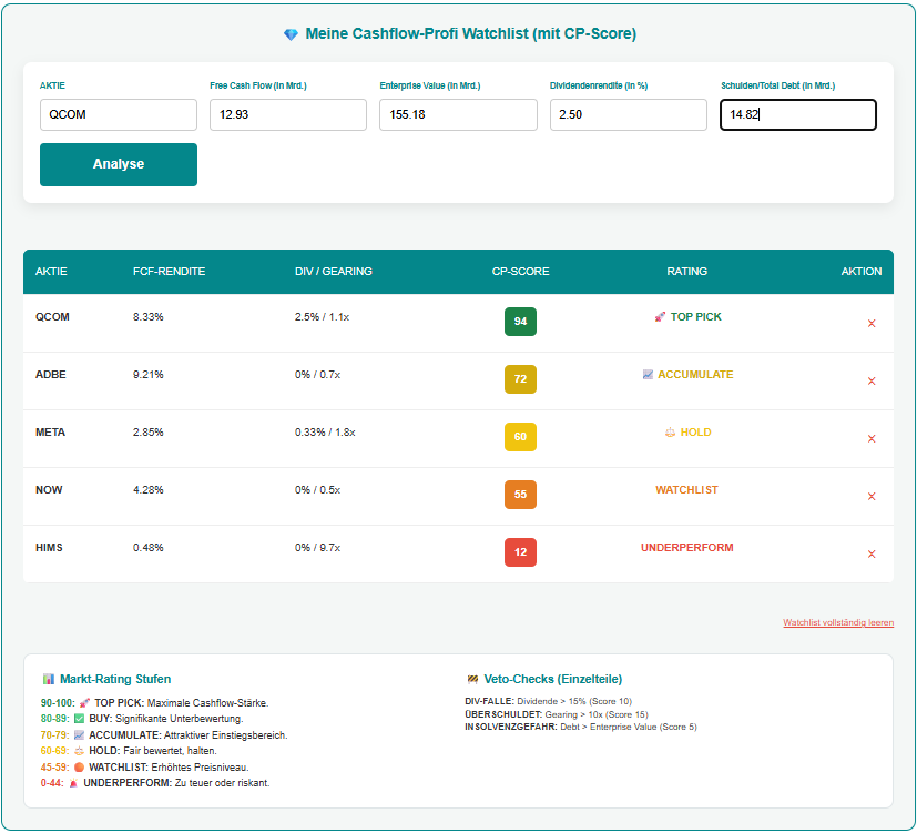 Diese Kennzahl vereint Cashflow-Rendite, Dividendenqualität und Kapitalstruktur zu einer messerscharfen Kennzahl, die die Cashflow-Stärke eines Unternehmens präzise sichtbar macht. In Kombination mit Geschäftsmodell- und Bewertungsanalyse erkennst Du sofort, welche Qualität wirklich hinter einer Aktie steckt.