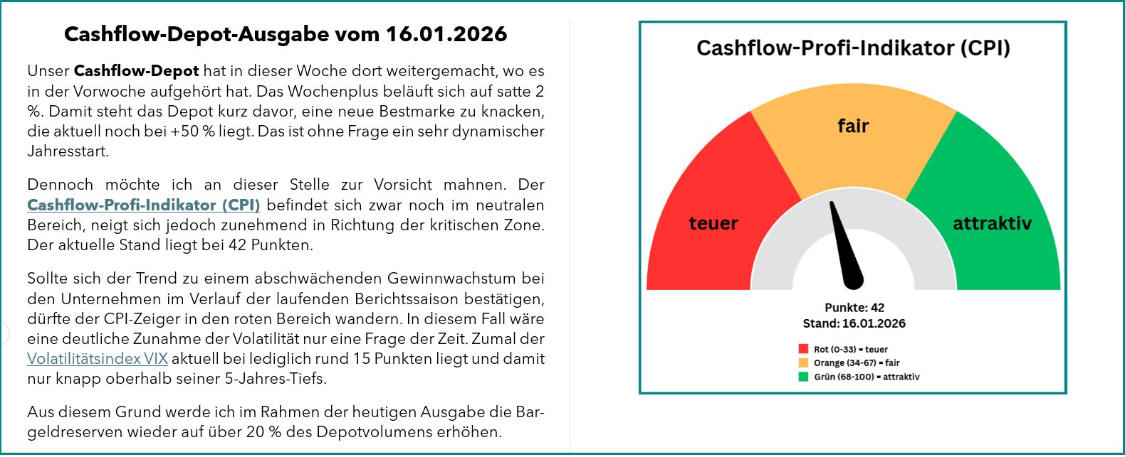 Wie Du bereits weißt, habe ich seit Jahresanfang den Cashflow-Profi-Indikator (kurz CPI) eingeführt. Der Indikator wird wöchentlich im Premiumbereich des Dashboards aktualisiert und liefert Dir damit fortlaufend eine klare, datenbasierte Einschätzung auf einer Skala von 1 bis 100.