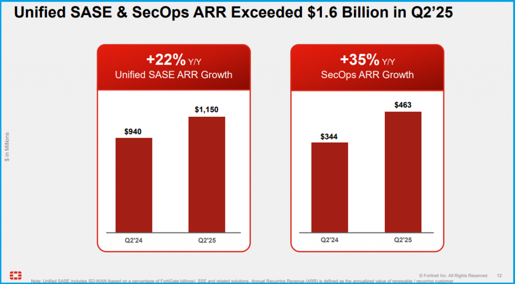 Und so legte Fortinet im zweiten Quartal um 14 % beim Umsatz und um 15 % bei den Billings zu – dank seiner Plattformsegmente Unified SASE und Security Operations, deren jährlich wiederkehrende Umsätze (ARR) um 22 % respektive 35 % zulegten.