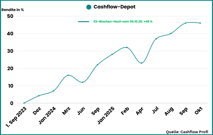 Die Aktie befindet sich sowohl in unserem Wachstumsdepot mit einem Kursplus von 160 % als auch in unserem Cashflow-Depot mit einem Plus von 95 %.