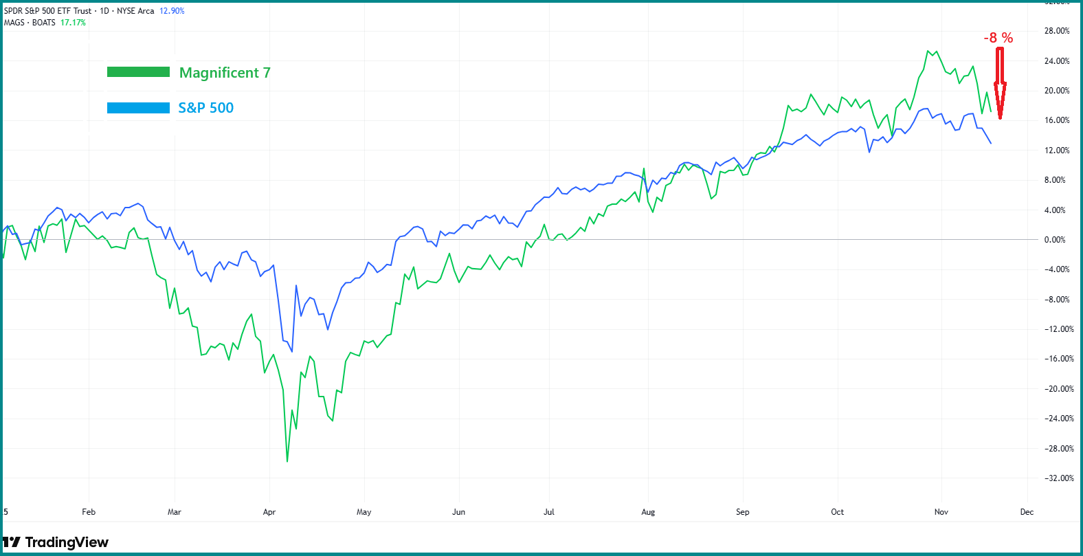 Auffällig ist, dass mehrere Titel aus den „Magnificent 7“ inzwischen deutlich unter ihren Hochs notieren. Wie Du dem nachfolgenden Chart entnehmen kannst, hat Mag 7 in den vergangenen Tagen einen großen Teil seiner Outperformance (YTD) gegenüber dem S&P 500 eingebüßt.