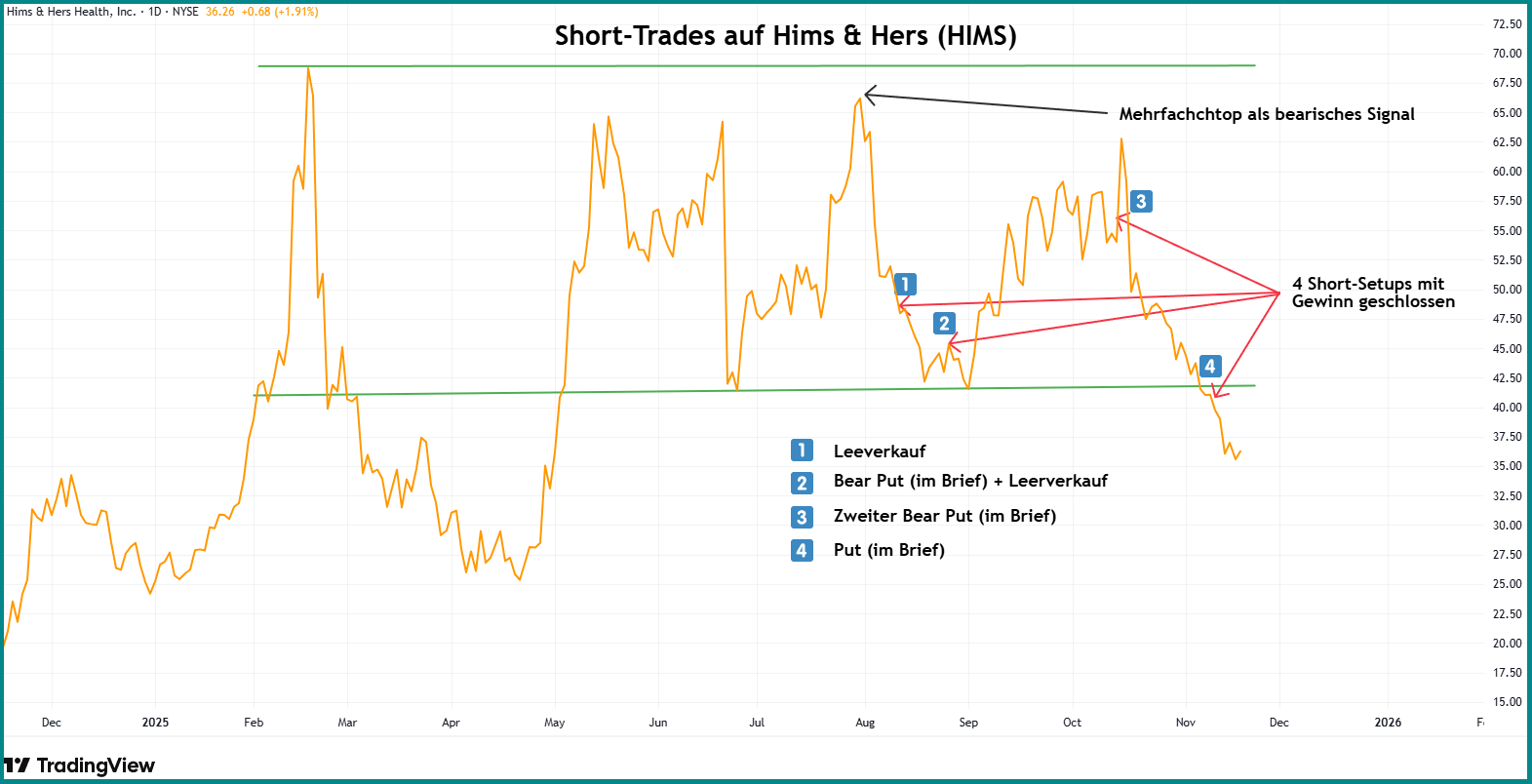 Ein aktuelles Beispiel ist Hims & Hers – ein wachstumsstarker, aber noch wenig profitabler Telehealth-Anbieter. Seit August habe ich die Aktie mehrfach geshortet und jedes Mal deutliche Gewinne eingefahren. Zuletzt brachte ein einfacher Put in unserem Stillhalter-Depot innerhalb von nur sechs Tagen rund 90 % Gewinn.