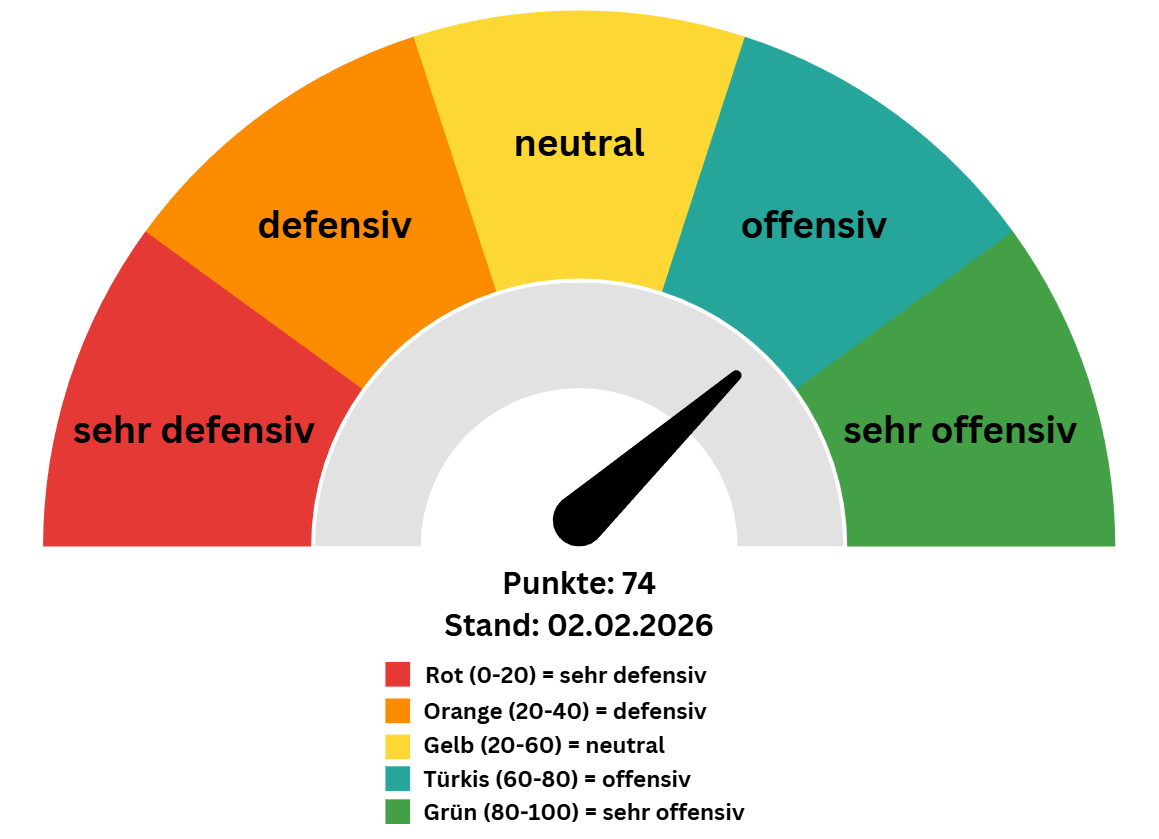 Aus der gewichteten Gesamtschau ergibt sich ein Score zwischen 0 und 100, der die aktuelle Marktlage von defensiv bis offensiv einordnet.